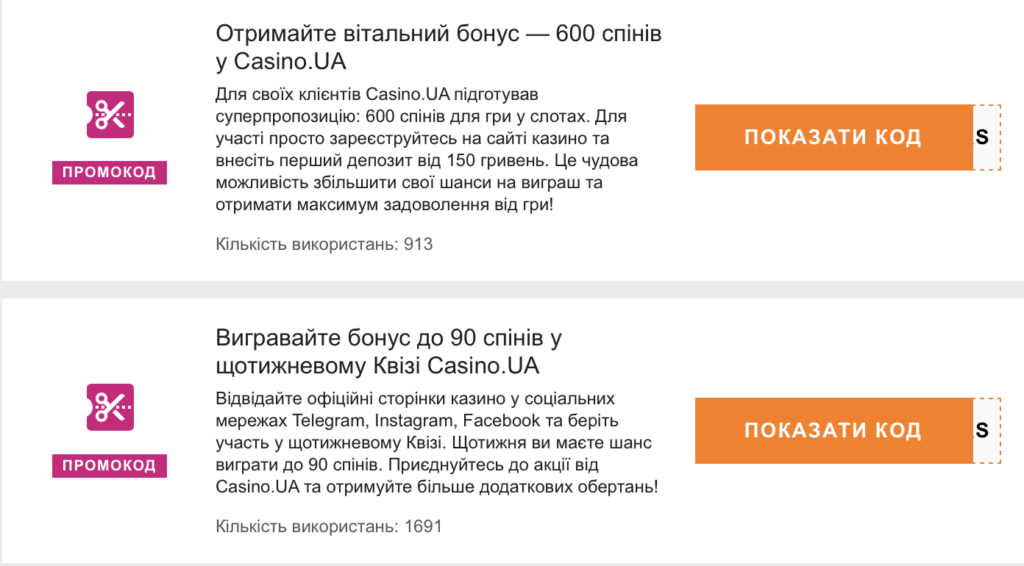 Офіційний сайт Казино UA регулярно публікує актуальні промокоди в розділі акцій. Email-розсилки для зареєстрованих користувачів часто містять ексклюзивні коди, недоступні в інших джерелах. Офіційні сторінки в соціальних мережах також є джерелом промокодів та інформації про спеціальні акції.