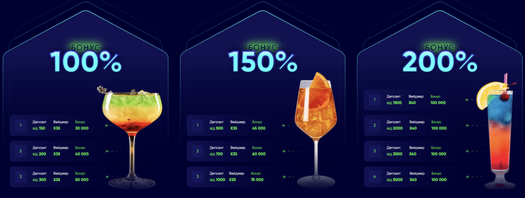 Вітальний пакет складається з трьох різних варіантів, кожен з яких розрахований на різні категорії гравців. Перший пакет пропонує 100% бонус на депозит, другий – 150%, а третій – 200%. Такий підхід дозволяє кожному знайти оптимальний варіант відповідно до своїх фінансових можливостей та ігрових цілей.