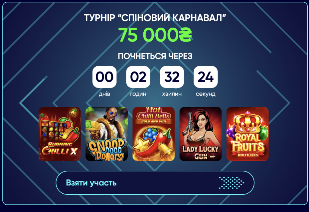 Щотижневі турніри проводяться на найпопулярніших слотах платформи з фондами від кількох тисяч до десятків тисяч гривень. Місячні чемпіонати мають значно більші призові фонди та тривають протягом 30 днів. VIP-турніри для привілейованих гравців пропонують ексклюзивні умови та унікальні призи.