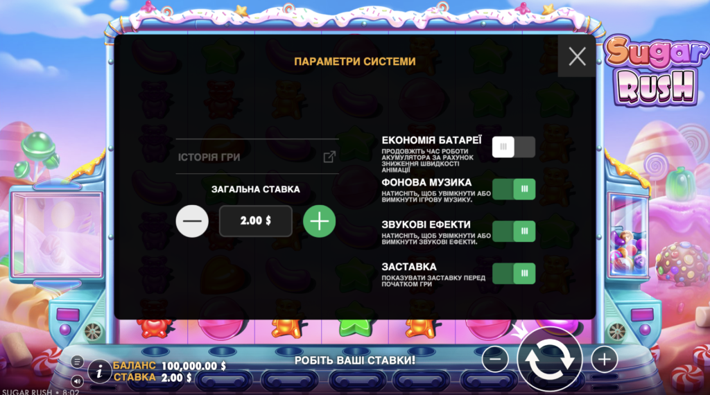 Шугар Раш слот  дозволяє встановити ставку від 0,2 до 100 монет, що підходить як новачкам, так і хайроллерам. У налаштуваннях можна активувати автогру та турборежим для швидшого геймплею. Завдяки простому управлінню кожен гравець легко підлаштує слот під свої уподобання.